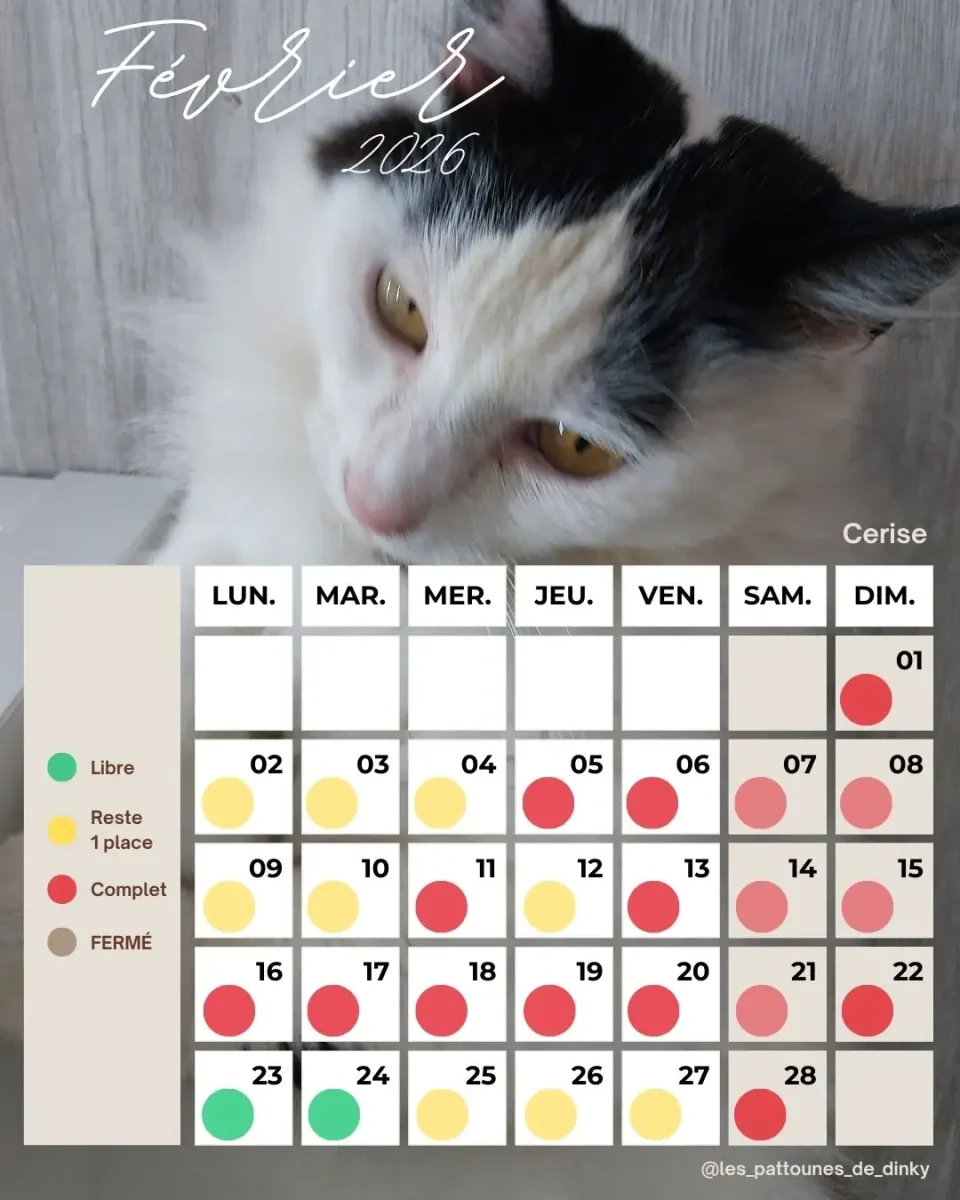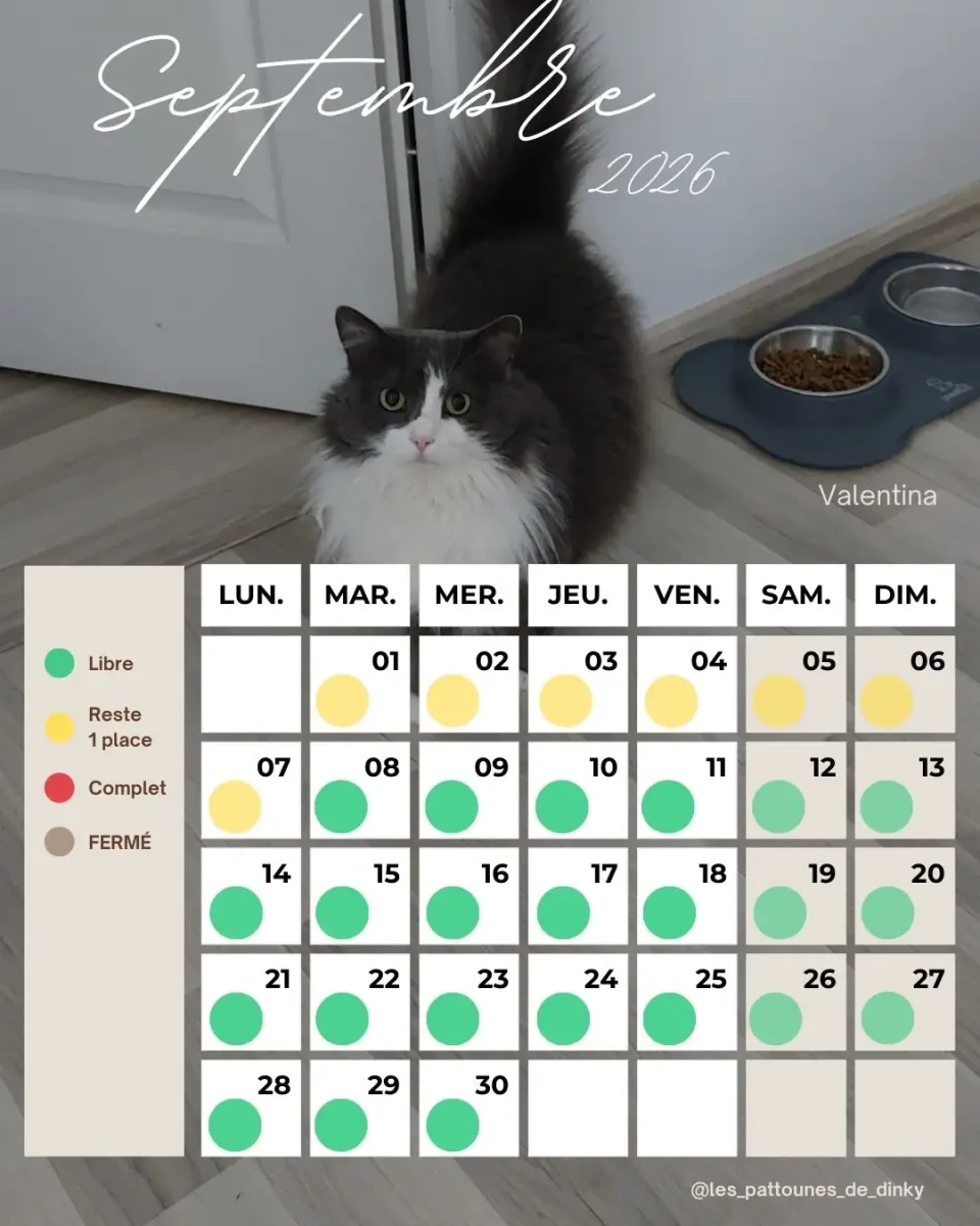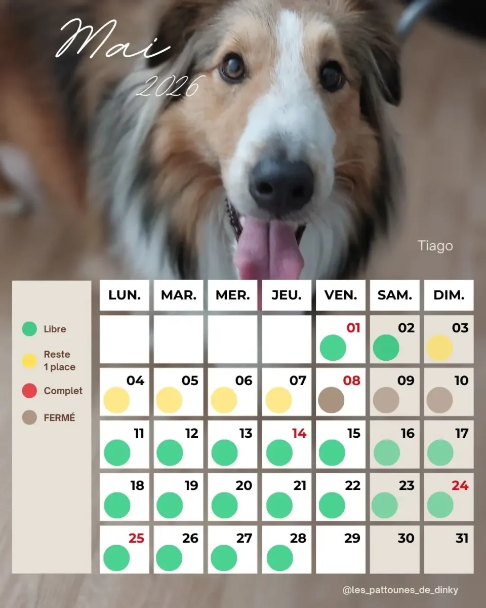 D’un seul coup d’œil, vous pouvez identifier les périodes où je suis disponible pour accueillir vos animaux.