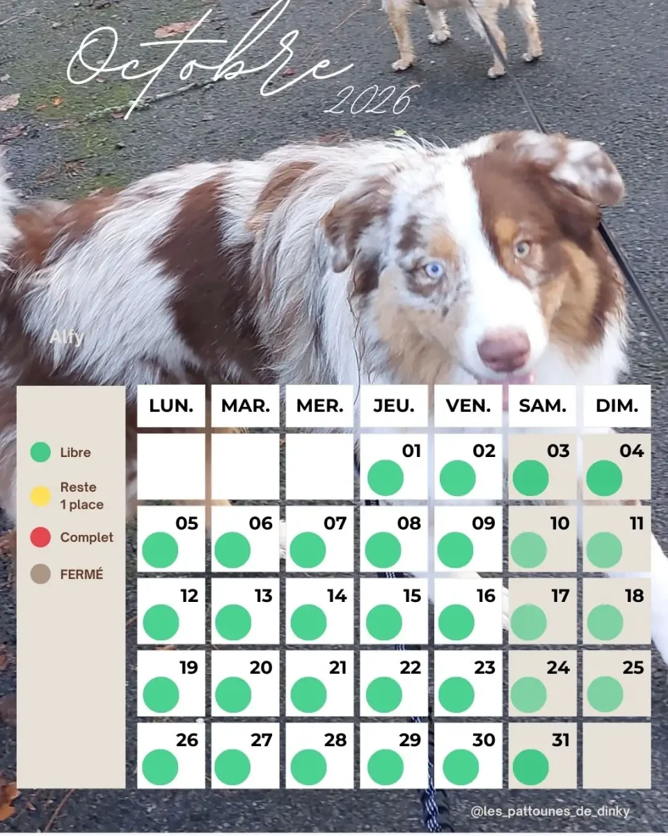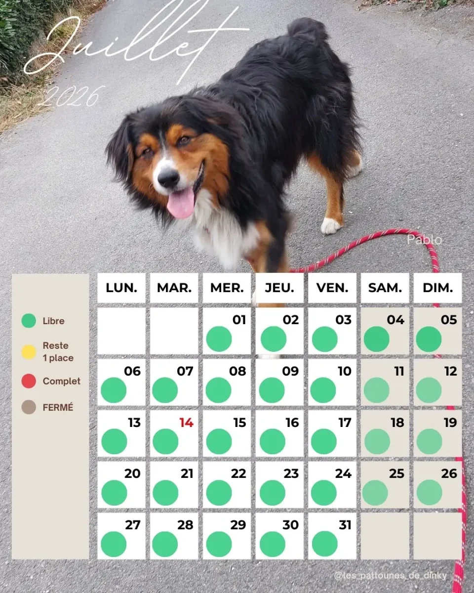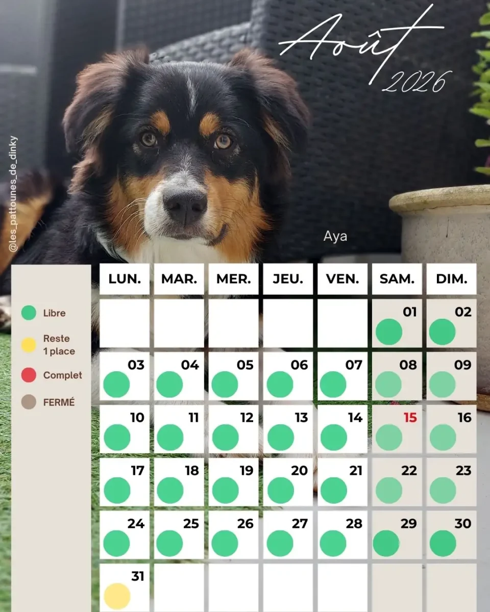 D’un seul coup d’œil, vous pouvez identifier les périodes où je suis disponible pour accueillir vos animaux.