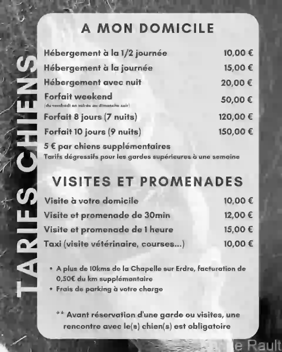 Vous trouverez ci-dessous le détail de nos tarifs. Ces prix sont indicatifs et peuvent varier en fonction de la durée du séjour de votre animal .